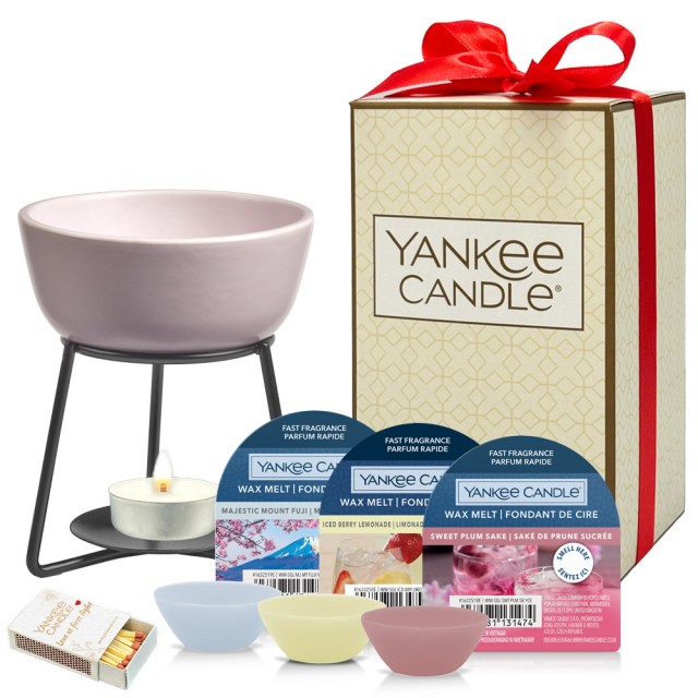 Set cadou format din aromatizor Yankee Candle Pebble Pink Lilac, 3 bucati ceara parfumata: Iced Berry Lemonade, Majestic Mount Fuji, Sweet Plum Sake, lumanare tip pastila neparfumata, impachetate in cutie de cadou.