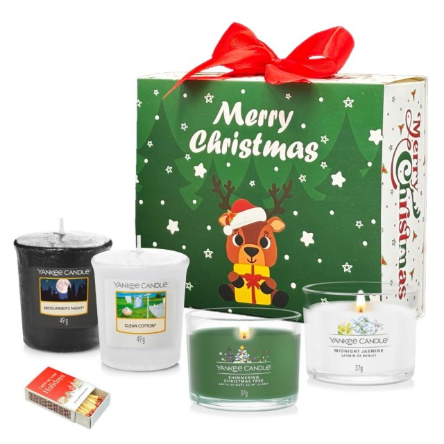 Un cadou vesel și parfumat, perfect pentru a aduce magia sărbătorilor în orice locuință. Setul conține două lumânări în sticlă Yankee Candle (37 g) și două lumânări votive (49 g), oferind o varietate de arome pentru toate gusturile – de la note festive și condimentate, la tonuri florale, dulci și fresh.