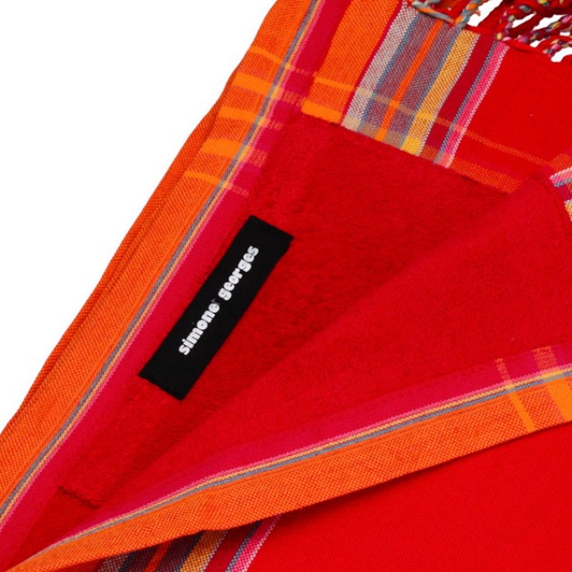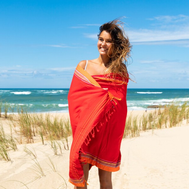 Prosopul de plaja Carbet aduce cu sine caldura si energia Caraibelor, fiind alegerea ideala pentru zilele toride de vara. Cu un design vibrant in nuante de rosu intens, completat de o bordura portocalie si dungi multicolore, acest prosop transforma orice aparitie pe plaja intr-una plina de stil si culoare.