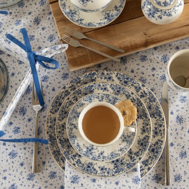 Blue Rose Blooming este dedicata in intregime trandafirului albastru. Aceasta gama simpla, dar foarte sugestiva, prezinta un model de trandafir frumos desenat in culoarea albastru Delft. Accentul albastru din margini completeaza imaginea, iar fundalul alb ofera un aspect proaspat.