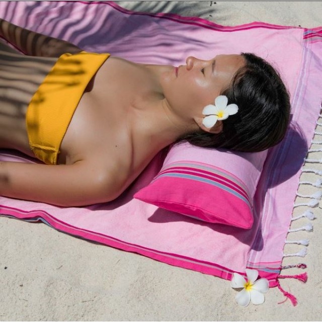 Conceputa pentru a transforma fiecare pauza intr-un moment de rasfat, aceasta perna combina un design practic cu materiale de calitate superioara. Husa este realizata din kikoy 100% bumbac pieptanat, un material traditional kenyan, moale, respirabil si rezistent, iar interiorul gonflabil iti ofera suport optim, adaptat preferintelor tale.