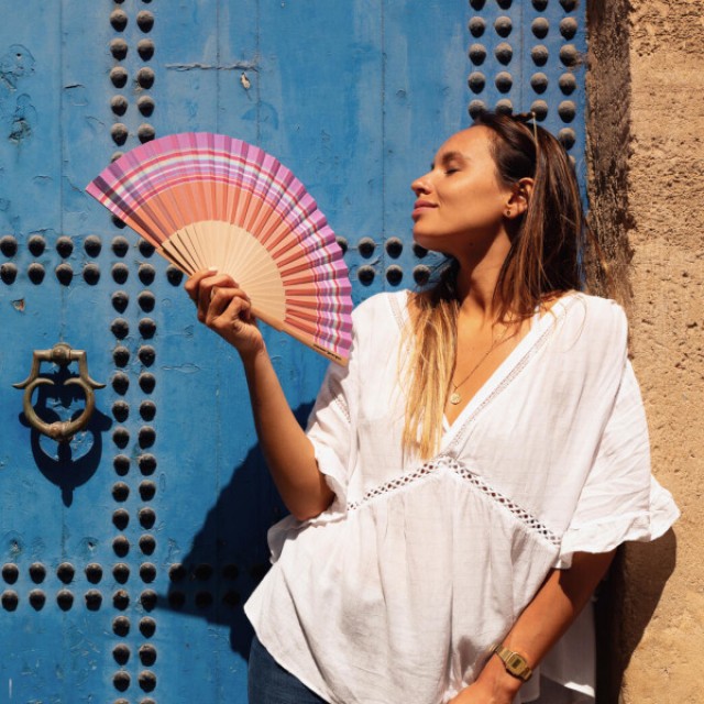 Inspirat dintr-un obiect clasic reinterpretat modern, acest evantai imbina designul rafinat cu functionalitatea. Realizat din bumbac imprimat si structura din lemn, ofera o senzatie placuta la utilizare si un flux de aer natural, perfect pentru zilele calduroase de vara.